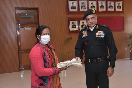 Smt Sunita Devi, one of the first beneficiaries of Naman receiving Naman cement release order Lt Gen Alok Singh Kler, PVSM, VSM, GOC-in-C, Southern Western Command, Indian Army.